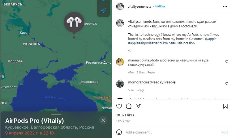“Zahvaljujući tehnologiji, znam gdje su moji AirPodsi sada. Ukrali su ga ruski borci iz moje kuće u Hostomelu”, rekao je, prenosi “Jutarni list.