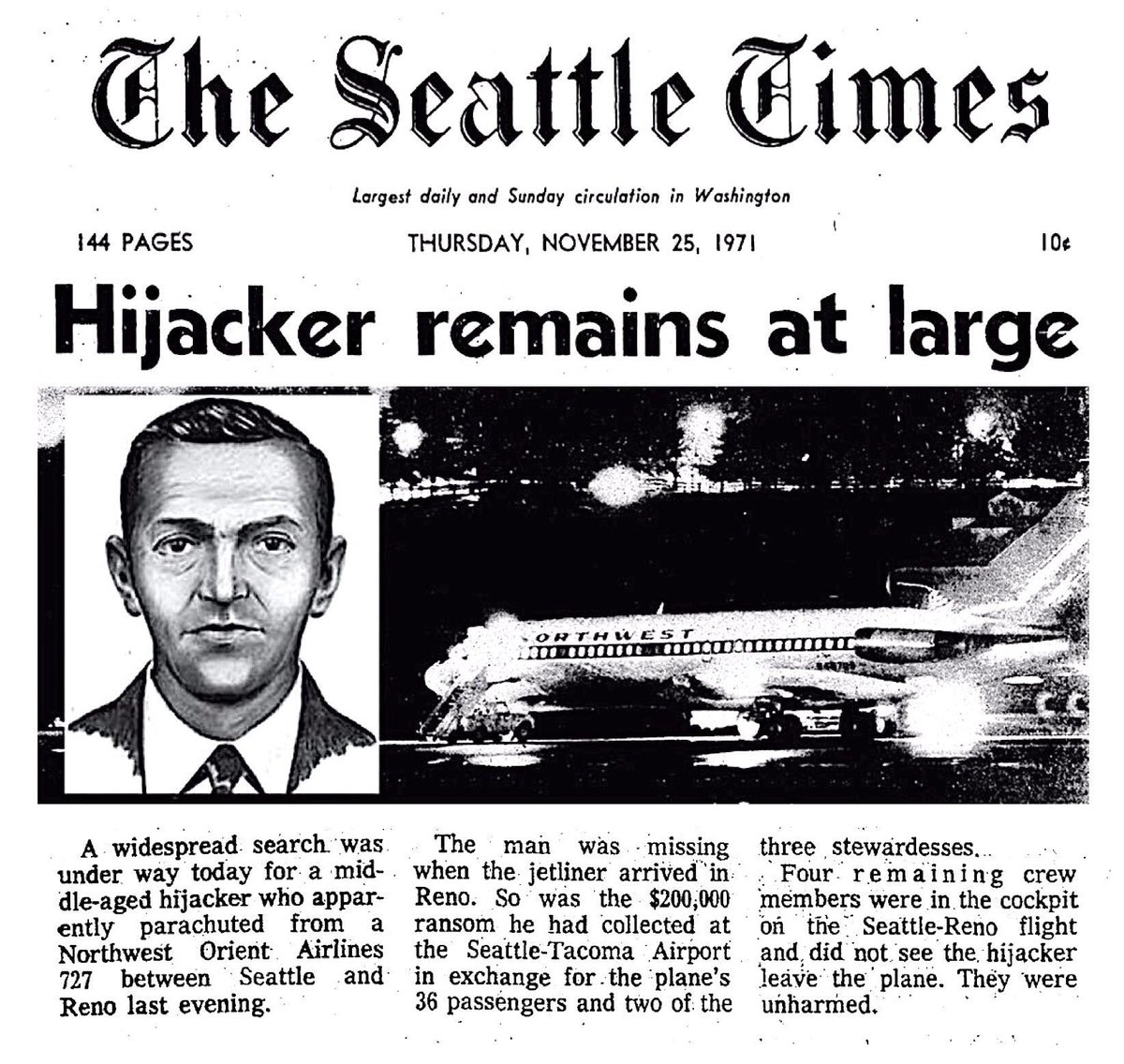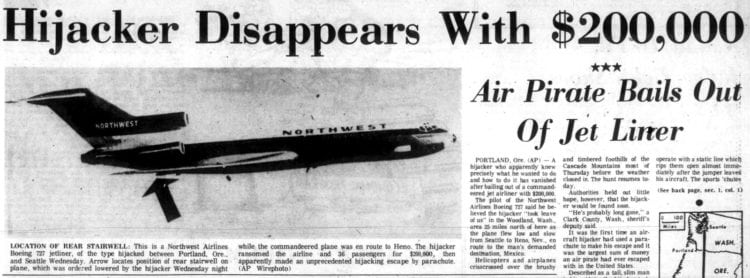 Cooper je tražio da avion leti na kursu prema Meksiku, a posada aviona je smatrala da, budući da je tražio četiri padobrana, planira da iskoči sa još tri taoca. Nakon samo pola sata leta, Cooper je naredio stjuardesama da odu u pilotsku kabinu. Nedugo zatim, aktivirao se alarm za dekompresiju (gubitak pritiska) u kabini, kao i svetlo za aktiviranje vrata za slučaj opasnosti. Bilo je jasno da je otmičar iskočio padobranom, ali posada još uvek nije znala da li je sa sobom poneo i bombu. Nakon sletanja na aerodrom u gradu Reno u Nevadi, policija i FBI su pretražili avion – bombe nije bilo, kao ni samog Coopera i torbe sa novcem.