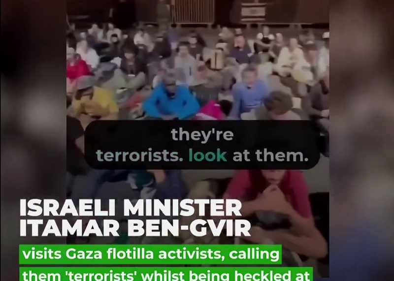 Israel’s National Security Minister Itamar Ben-Gvir used this phrase when visiting detained activists from the Global Sumud Flotilla, labeling their mission to Gaza as “terrorism”. pic.twitter.com/628XNsntLk