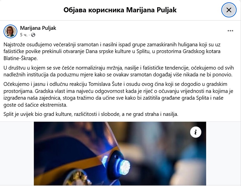 Marijana Puljak iz stranke Centar reagovala je na incident u Splitu. “Najstrože osuđujemo večerašnji sramotan i nasilni ispad grupe zamaskiranih huligana koji su uz fašističke povike prekinuli otvaranje ‘Dana srpske kulture’ u Splitu, u prostorima Gradskog kotara Blatine-Škrape.