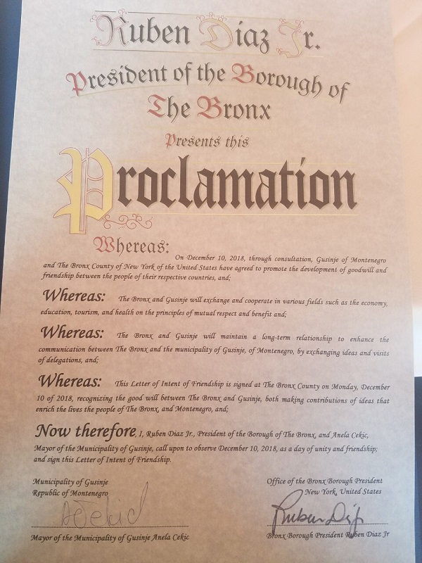 Povelja o bratimljenju opština Gusinje i Bronks potpisana je danas.