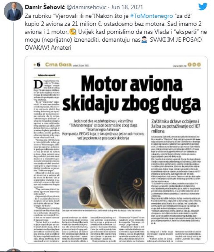 “Za rubriku “Vjerovali ili ne”. Nakon što je ToMontenegro ‘za dž’ kupio dva aviona za 21 milion, ostadosmo bez motora”, napisao je na Twitteru potpredsjednik Socijaldemokrata Damir Šehović.