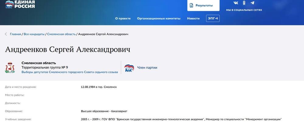 Na sajtu Jedinstvene Rusije stoji da je Andreenkov u maju učestvovao na preliminarnim, stranačkim izborima za kandidate za sedmi saziv gradskog vijeća u ovom gradu na zapadu Rusije, blizu granice s Bjelorusijom.