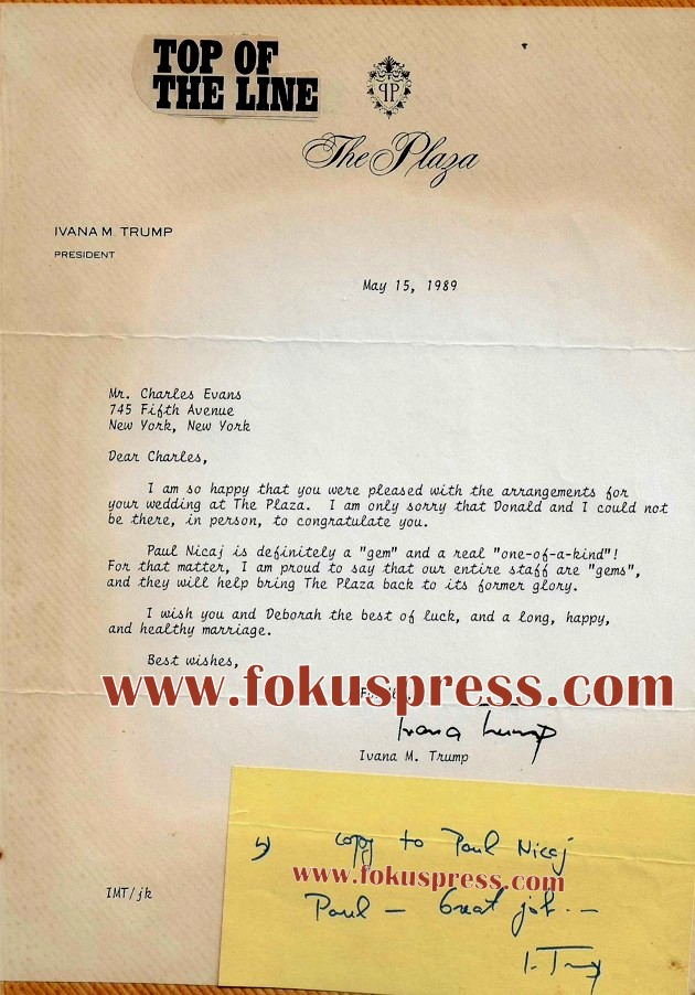 Mnogo mi je drago što ste zadovoljni organizacijom vašeg vjenčanja u hotelu Plaza. Žao mi je što Donald i ja nijesmo mogli lično da prisustvujemo i čestitamo vam.