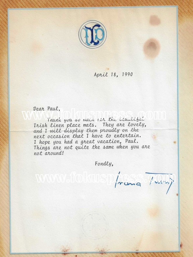 U bogatoj arhivi uspomena Paška Pola Nicaja nalazi se i jedno dirljivo pismo — lična zahvalnica Ivane Tramp, koja je decenijama važila za simbol njujorškog glamura i stila.