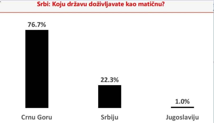 Srpski narod Crnu Goru kao matičnu državu doživljava 76,7 odsto ispitanika, dok 22,3 odsto smatra Srbiju svojom matičnom državom. Manji procenat, 1 odsto, naveo je Jugoslaviju.