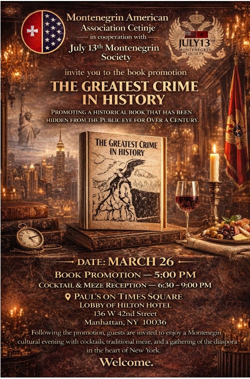 Crnogorska dijaspora u Sjedinjenim Američkim Državama okupiće se 26. marta u Njujorku na promociji knjige „The Greatest Crime in History“, u organizaciji Montenegrin American Association Cetinje i crnogorskog udruženja „13. jul“ iz Njujorka.