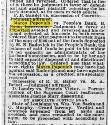 Na dan Svetog Đorđa 2010. godine pošao sam prvi put na slavu kod porodice moje supruge na Luštici. U njihovom starom bokeškom salonu, u kući iz 18. vijeka, pored brojnih uspomena s pomorskih putovanja i posjeta Veneciji, Beču i Americi, nalazila se zanimljiva fotografija pored slike mitropolita Mitrofana Bana — rođenog strica pokojne tastove majke Vjere Ban. Odmah sam prepoznao onu južnjačku, američku patinu na fotografiji. Upitao sam čija je i rečeno mi je da je u pitanju brat čukunđeda, Marko Popović iz Nju Orleansa.